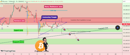 За словами аналітика криптовалют Pejman_zwin на платформі TradingView, Bitcoin коливається в межах злиття опору та коротких зон ліквідації, що розтягується від 105,330 до 107 120 доларів. Цей діапазон, зазначає він, є не лише зоною структурного опору, але й відповідає кумулятивній площі з обмеженими ліквідацією.