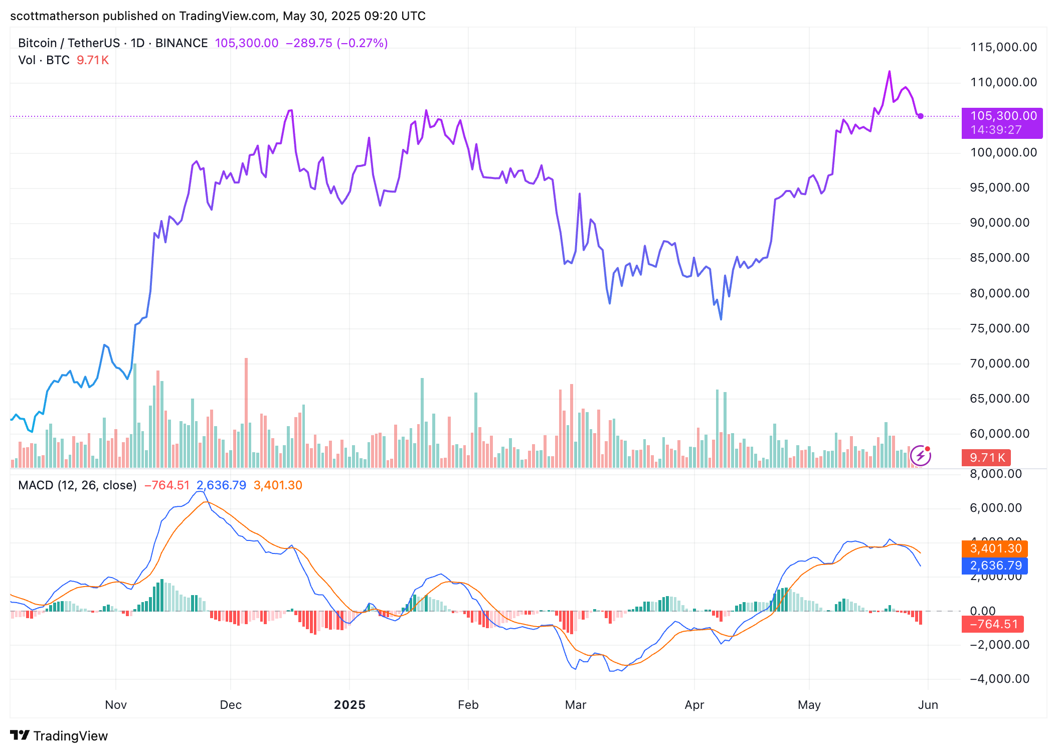 BTC Trading на рівні 105 300 доларів на 1D -діаграмі |Джерело: BTCUSDT на TradingView.com