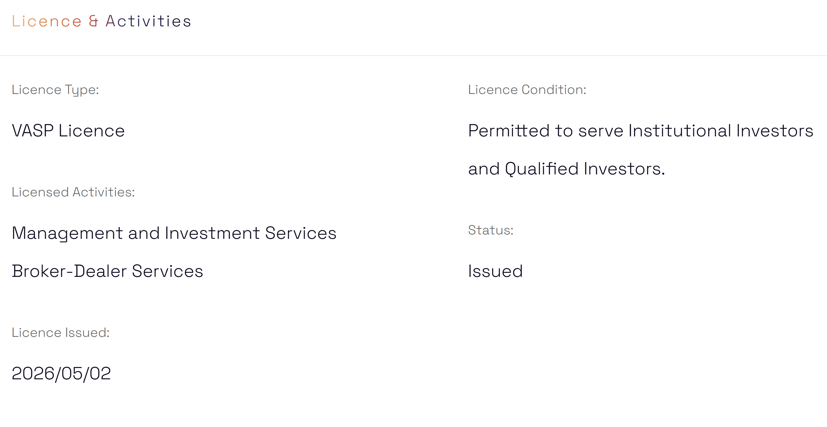 Публічний реєстр VARA показує, що ліцензію було видано 5 лютого. Вона дозволяє фірмі обслуговувати інституційних і кваліфікованих інвесторів під наглядом VARA Дубая.