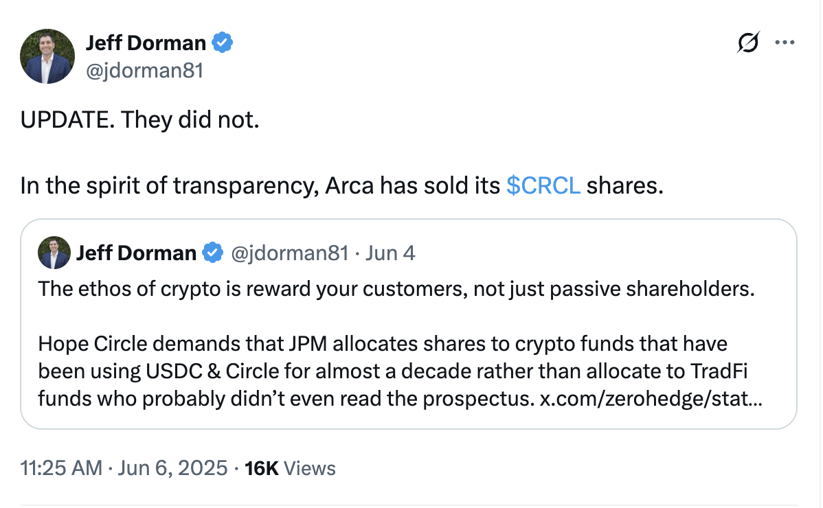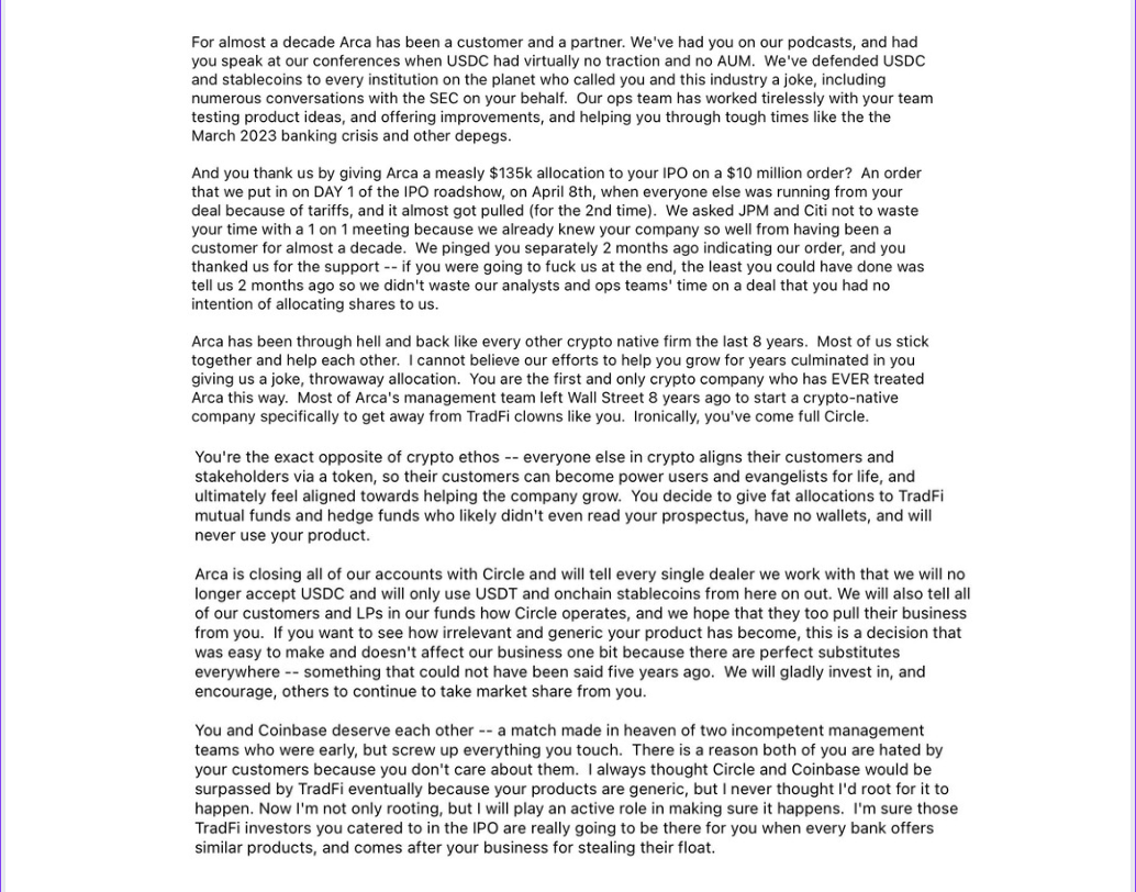 За даними Dorman, ARCA подала замовлення на 10 мільйонів доларів акцій Circle у квітні 2025 року і отримала лише 135 000 доларів США, незважаючи на те, що він був давнім прихильником та одним із найдавніших інвесторів, які подали заявку. Виконавчий директор написав у теперішньому видаленому листі: