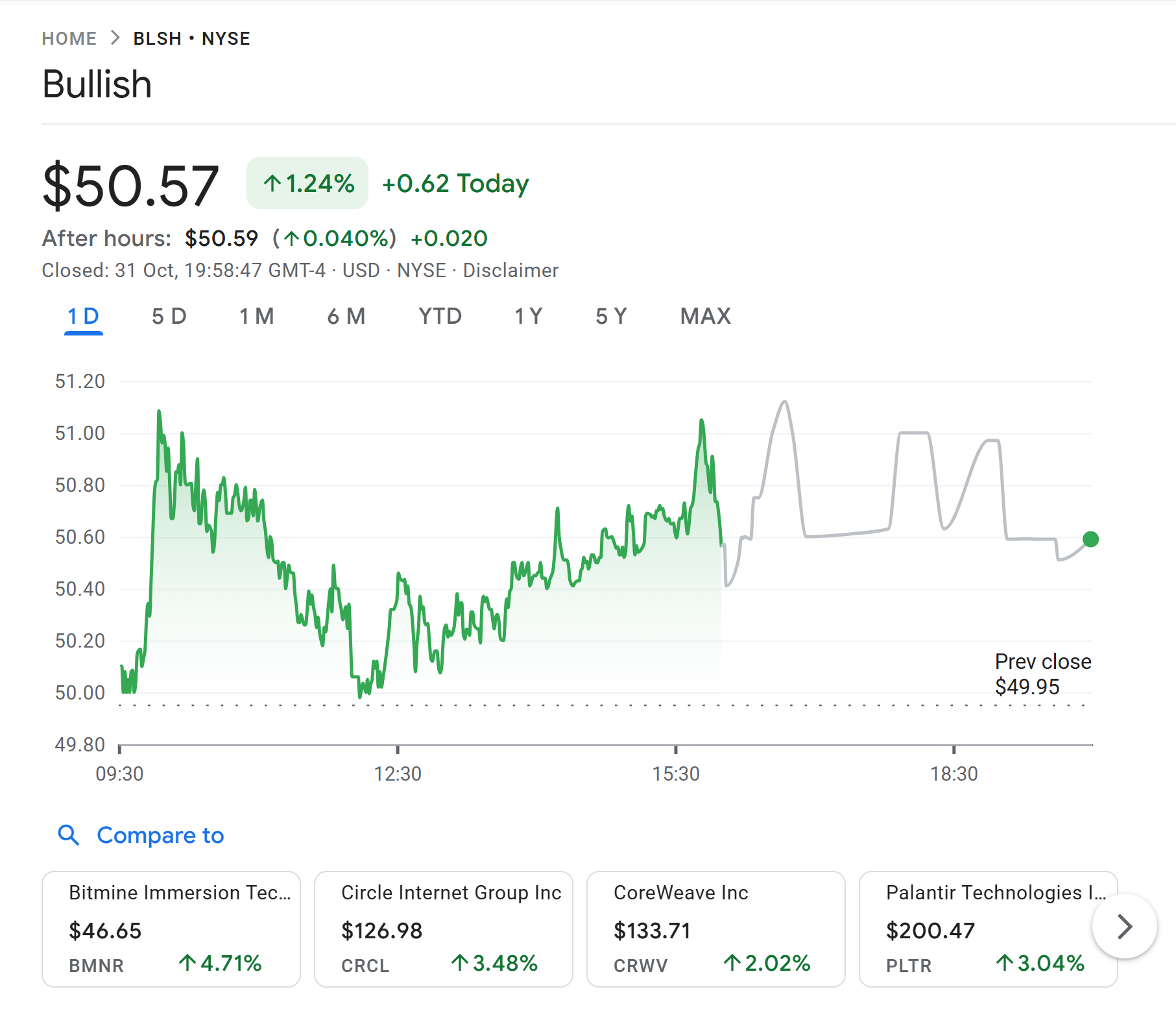На початку жовтня Bullish був офіційно запущений у 20 штатах США після отримання ліцензії BitLicense та ліцензії на передачу грошей від регуляторних органів Нью-Йорка. Платформа розпочала спотову торгівлю з BitGo та Nonco як першими клієнтами.