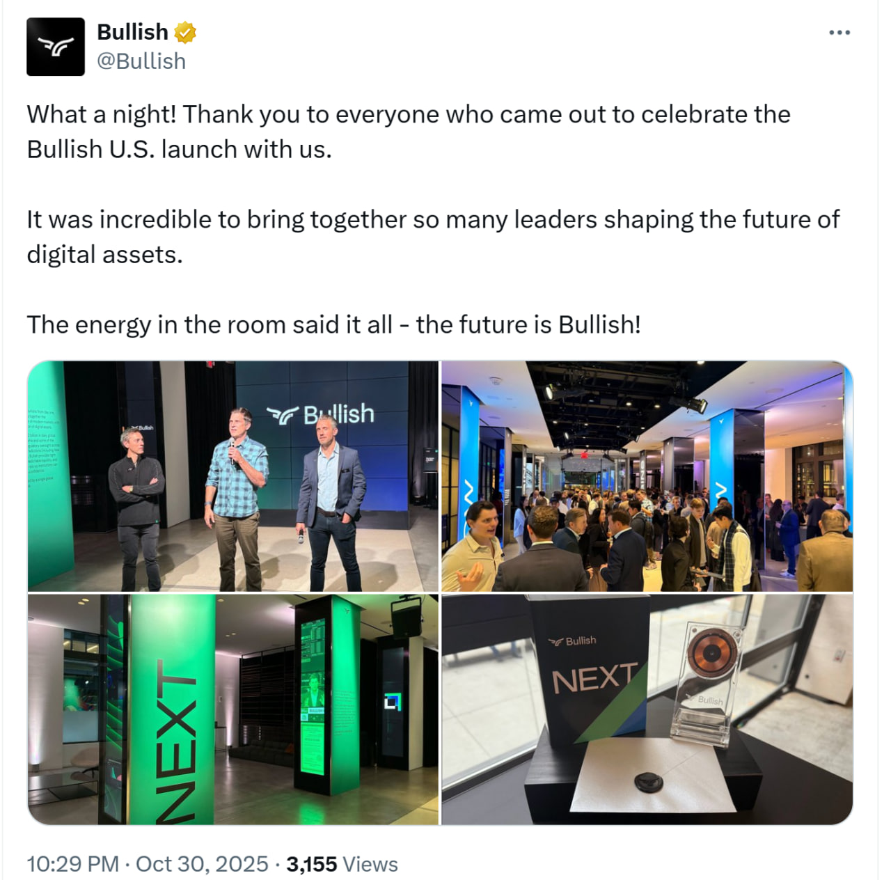 Ці покупки збіглися з подією запуску Bullish у США в Нью-Йорку, де компанія зібрала лідерів цифрових активів, щоб відсвяткувати своє розширення. «Енергія в кімнаті сказала все — майбутнє оптимістично», — написала фірма на X після події.