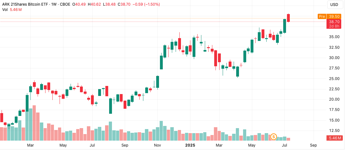 Останній продаж акцій ARKB в розмірі 8,7 мільйонів доларів акцій ARKB надійшов, коли його біткойн ETF торгувався поблизу рекордних максимумів.6 липня фонд досяг 39,3 доларів, який-на основі попередньої розсилення-дорівнює максимуму за весь час у розмірі 117,9 доларів за акцію.