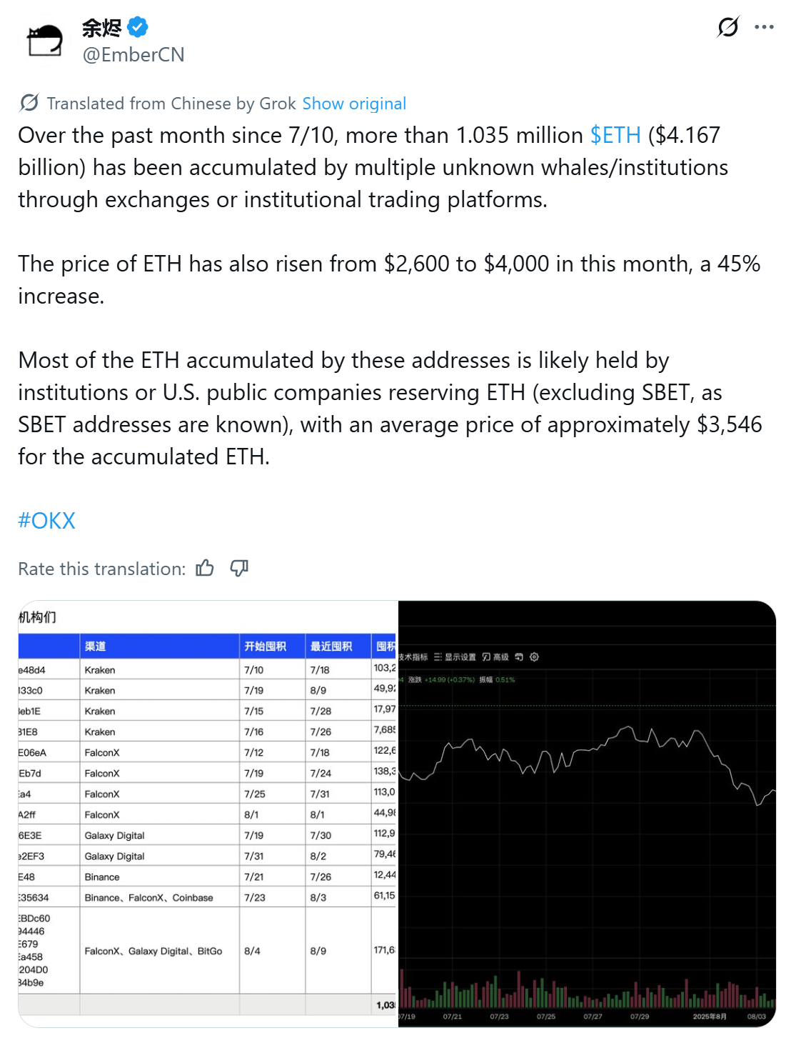 Починаючи з 10 липня, понад 1,035 мільйона ETH, вартістю приблизно 4,17 мільярда доларів, накопичувались кластером невідомих китів та установ через біржі та інституційні торгові платформи, згідно з даними, накопиченими Embercn.