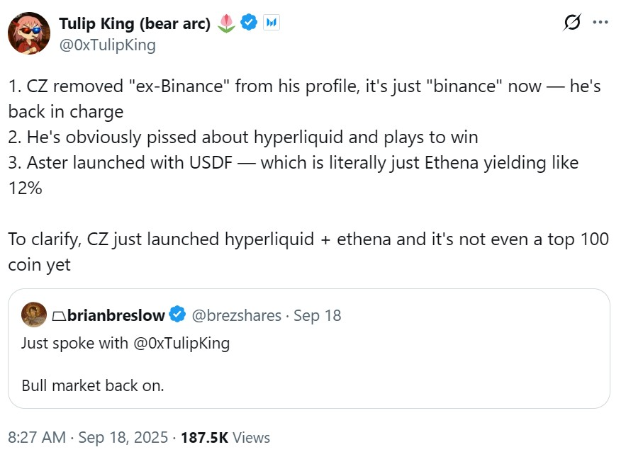 Співзасновник Binance Changpeng “CZ” Чжао привітав Астер на X, написавши “Продовжувати будівництво”. Коментар викликав спекуляції, що Чжао може бути за проектом, деякі користувачі вказують на зміни в його профілі та припускають, що ASTER було запущено у відповідь на зростання гіперлікіди.