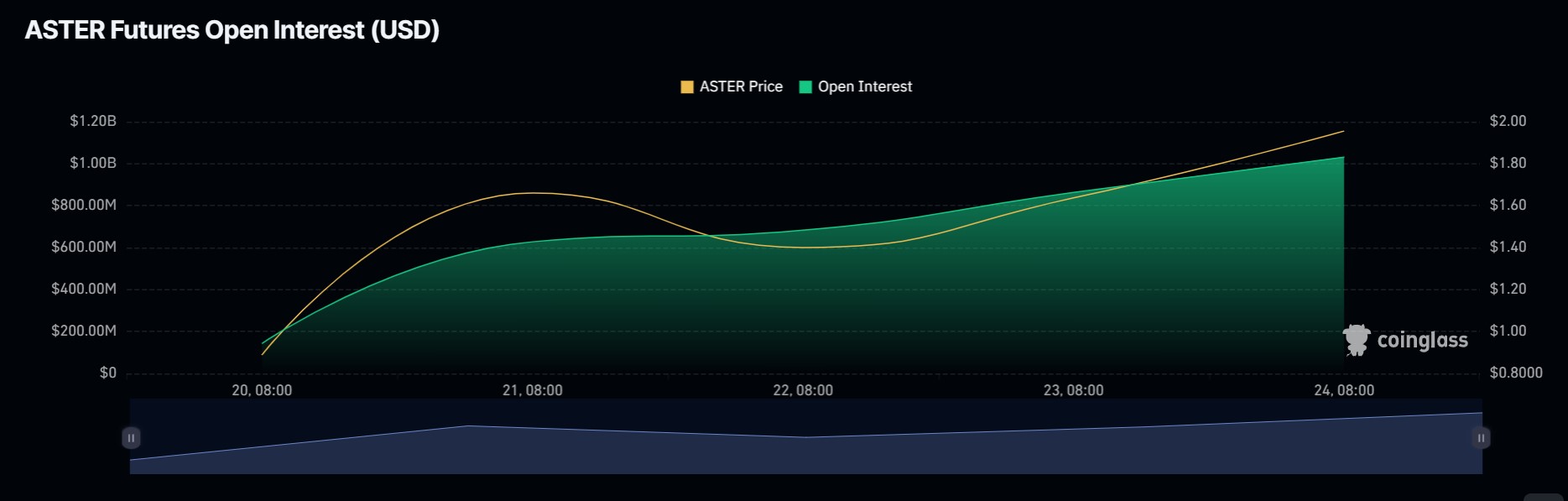 У середу дані Coinglass показали, що відкритий відсоток Астера підскочив з 3,72 мільйона доларів минулої п’ятниці до 1,25 мільярда доларів на момент написання. Шип активних контрактів сигналізує про те, що торговці накопичуються на платформу, кидаючи виклик його найбільшого конкурента, гіперліцивід.