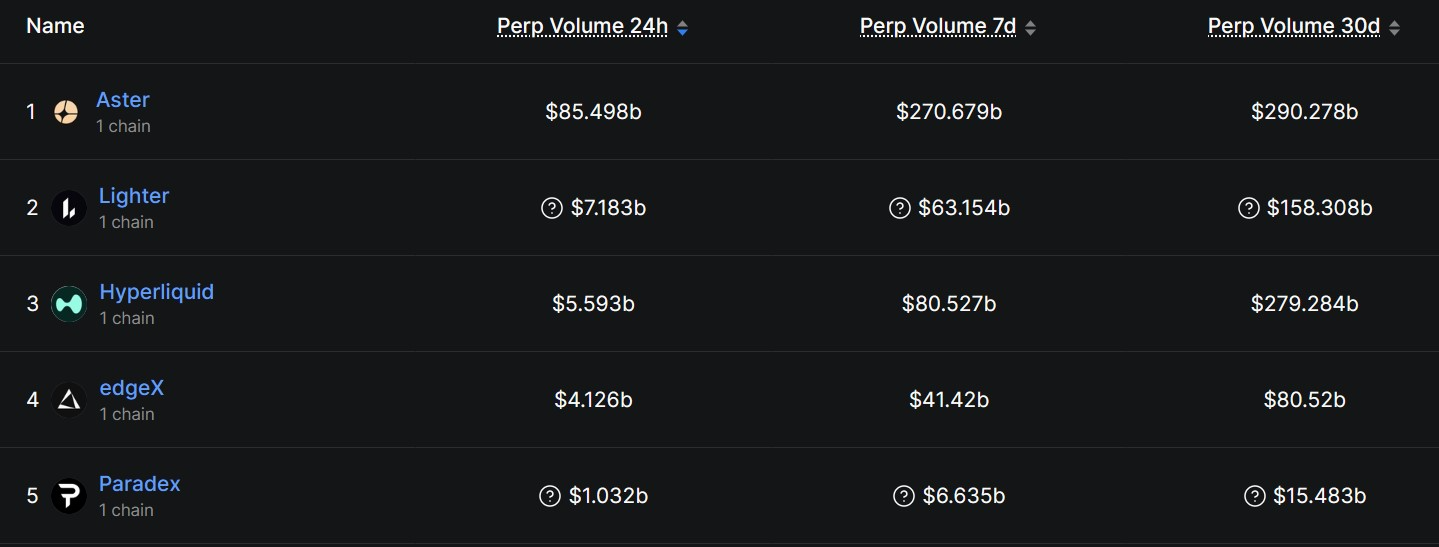 У понеділок Defillama показав, що цілодобовий обсяг торгів Астера підскочив до 85 мільярдів доларів, що в 12 разів більше, ніж його найближчого конкурента в день, легше.