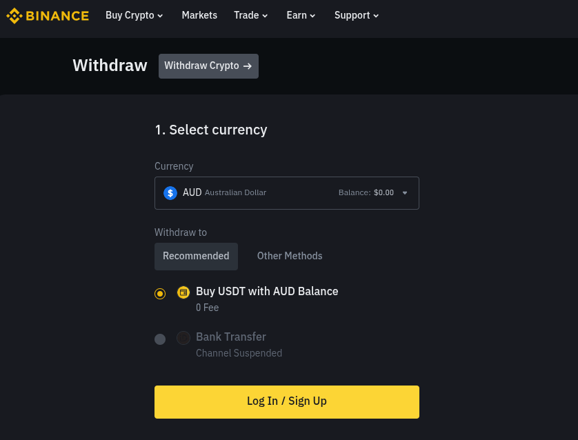На сьогоднішній день Binance радить користувачам, які мають намір зняти австралійські долари з платформи або придбати StableCoin USDT (USDT), щоб передати кошти з платформи або використовувати послуги з одноранговими торгівля. Параметр “Банківський переказ” сірений з повідомленням “призупинено каналом”.