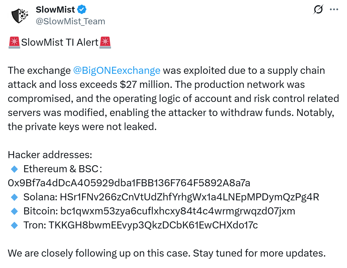 Обмін криптовалютою Bigone зазнав сторонньої атаки, спрямованої на її інфраструктуру гарячого гаманця, що призвело до того, що приблизно втрату приблизно 27 мільйонів доларів.