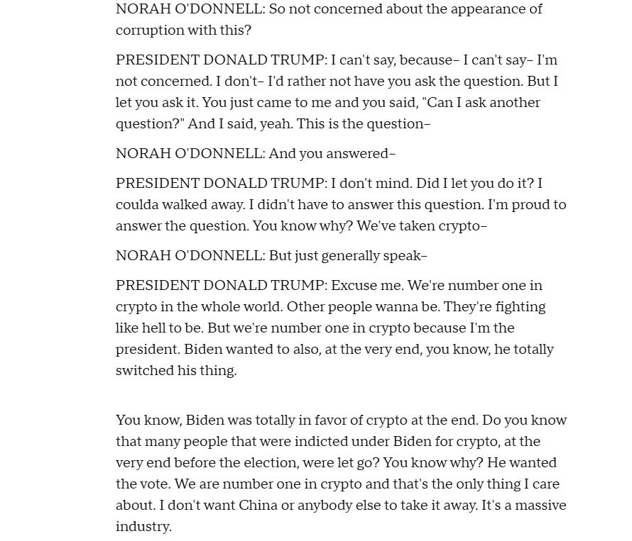 Перед скороченим запитанням Трамп сказав, що його сини більше залучені до криптовалюти, ніж він сам, і він «дуже мало про це знає, окрім одного. Це величезна індустрія».