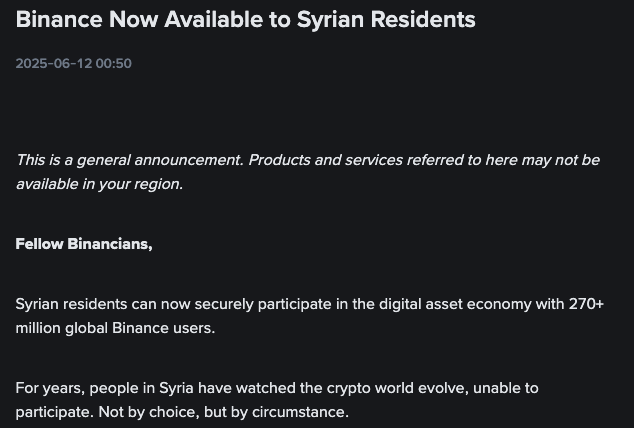 “Відповідно до чинних санкцій, такі платформи, як Binance, раніше не обслуговували користувачів у Сирії”, – зазначає повідомлення Бінанса, додавши, що Сирія більше не класифікується як заборонена країна за її умовами використання з останніми санкціями.