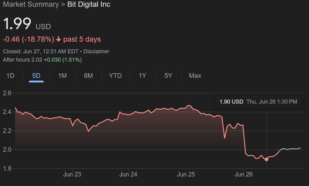 На цьому тижні колишня фірма з видобутку біткойна Bit Digital різко впала, ціна акцій знизилася майже на 19% за п’ятиденний період, що закінчиться на рівні 1,99 долара 27 червня, що на 15% за 24 години.