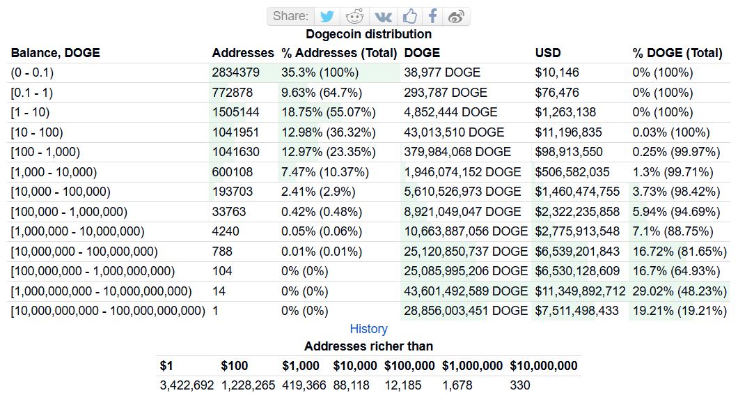 На даний момент Dogecoin значною мірою перекоситься до власників китів. Дані від трекера криптовалют Bitinfocharts показують, що понад 81% постачання Dogecoins проводиться серед 908 адрес.