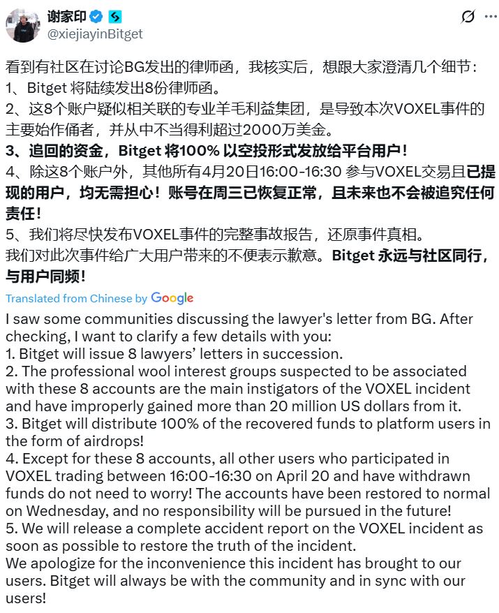 20 квітня Бітгет заявив, що виявив “ненормальну торгову діяльність” на своєму постійному ф’ючерсному контракті Voxel/USDT та призупиненні рахунків, які він підозрював у маніпуляції з ринком.