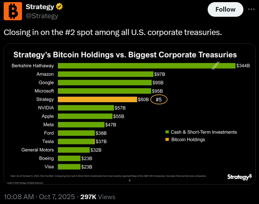 На початку цього тижня вартість стратегії приблизно 640 000 BTC ненадовго перевершила 80 мільярдів доларів, коли біткойн піднявся до нового найвищого за весь час на суму близько 126 000 доларів. Ця оцінка ставить резерв біткойна компанії в межах від 95 до 97 мільярдів доларів готівкою та еквівалентами, які зберігаються Amazon, Microsoft та Google Parent Alphabet.
