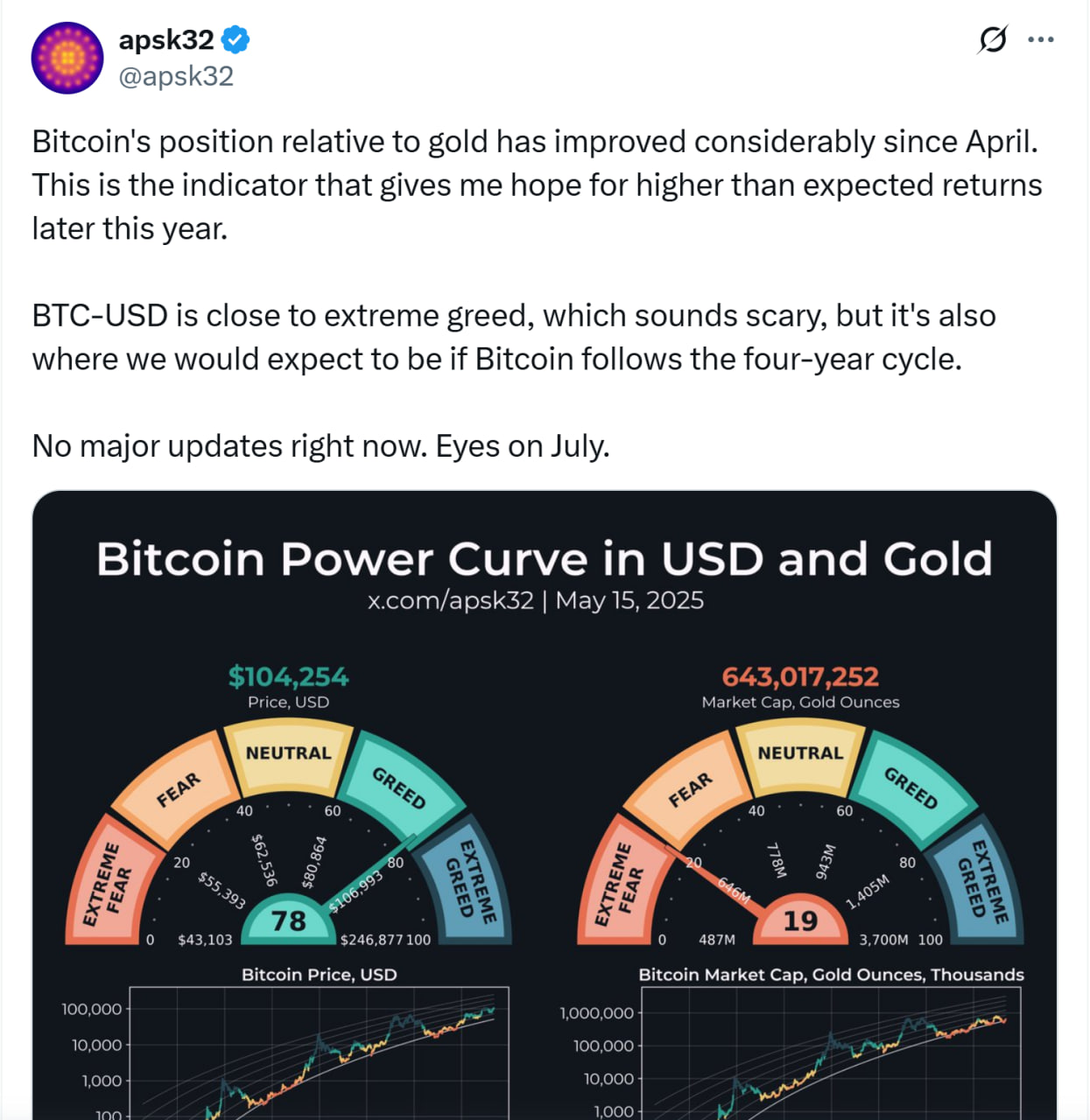16 травня обліковий запис X Analytics APSK32 стверджував, що Bitcoin має “пристойний шанс” вдарити 250 000 доларів США або більше у 2025 році, коли увага перетворюється на Gold Copycat.