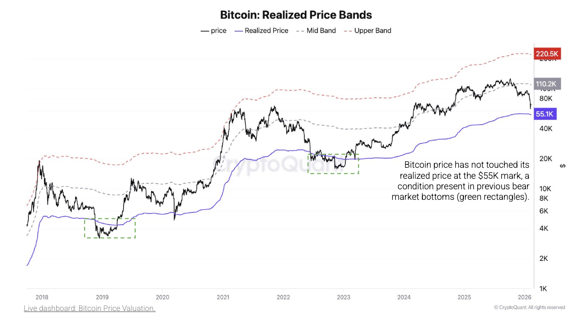 Платформа криптовалютної аналітики CryptoQuant повторила, що реалізована цінова підтримка залишається на рівні близько 55 000 доларів США і ще не була перевірена.