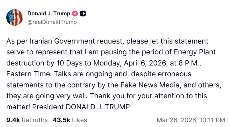 У четвер президент США Дональд Трамп оголосив про продовження режиму припинення вогню щодо енергетичної інфраструктури Ірану на 10 днів до 6 квітня, посилаючись на конструктивні поточні переговори.