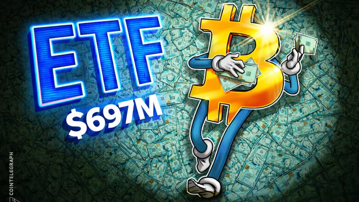 Згідно з даними Farside Investors, протягом другого торгового дня 2026 року у вівторок спотові біткойн-ETF у США залучили 697 мільйонів доларів США, забезпечивши чистий позитивний приплив понад 1,1 мільярда доларів у перші дні нового року.
