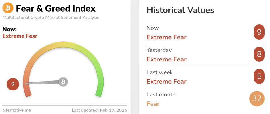 Незважаючи на те, що біткойн трохи відновився від багатомісячного мінімуму близько 60 000 доларів, зафіксованого на початку лютого, індекс в основному залишився на території «Надзвичайного страху».