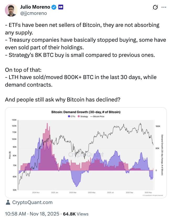 «Казначейські компанії фактично припинили купувати, деякі навіть продали частину своїх активів», — зазначив Морено, маючи на увазі такі компанії, як Metaplanet, чия остання купівля BTC відбулася у вересні.