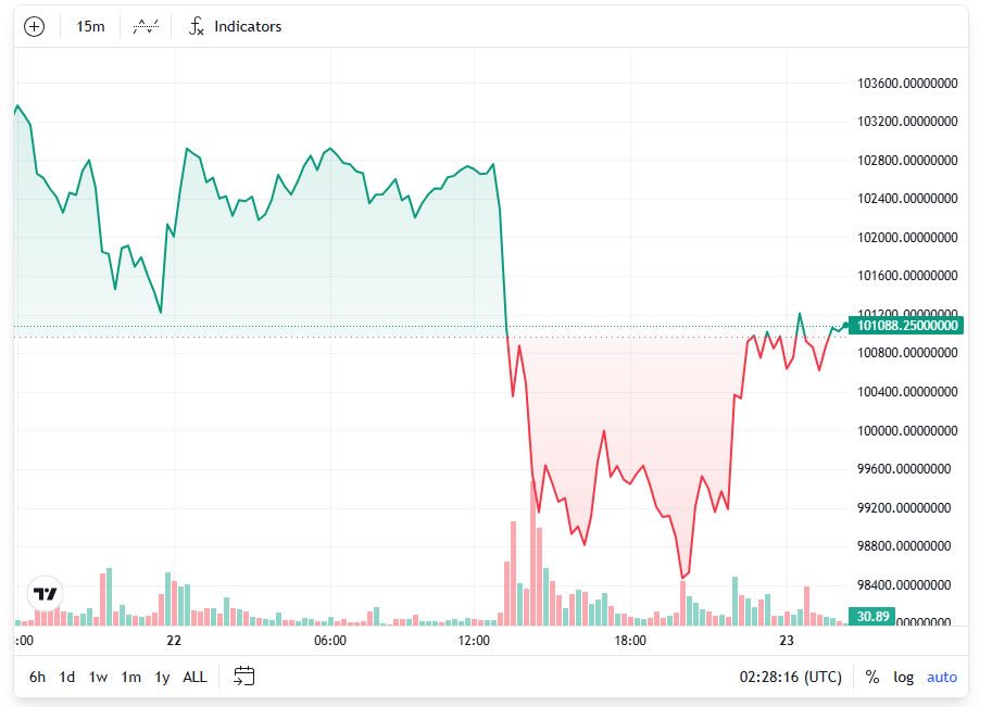 Однак падіння суб-шестигранних фігури не тривало довго, і активом відновив 101 000 доларів під час ранньої торгівлі в Азії в понеділок вранці.