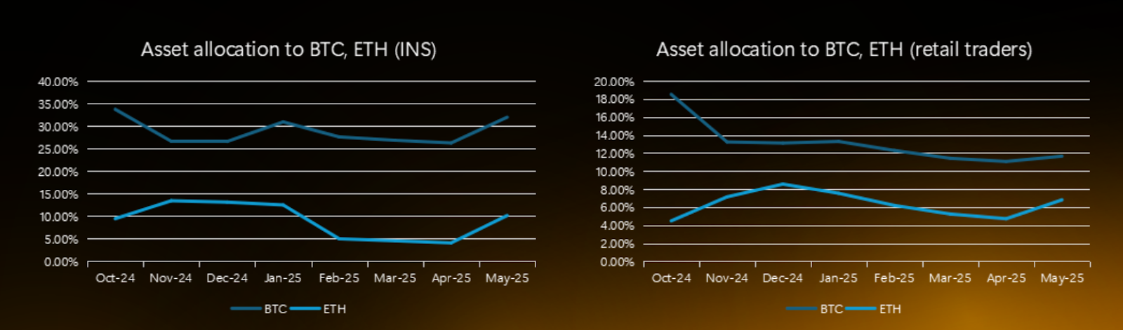 Біткойн (BTC) припадає на близько третини портфелів інвесторів, або 30,95% від загальної кількості активів, що зберігаються інвесторами станом на травень, порівняно з 25,4% у листопаді 2024 року.