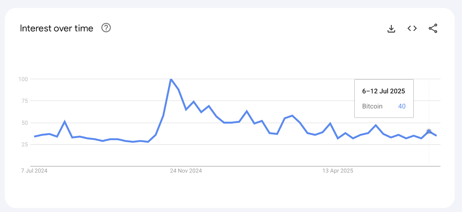 Google Global Search Feent для терміна “біткойн” збільшився на 8% з 29 червня-5 липня по 6–12 липня, збігаючись з тим, що біткойн порушив свій попередній високий рівень за весь час у розмірі 111 970 доларів у середу, і піднявся далі до 118 780 доларів до п’ятниці, згідно з даними Google Trends та CoinMarketCap.
