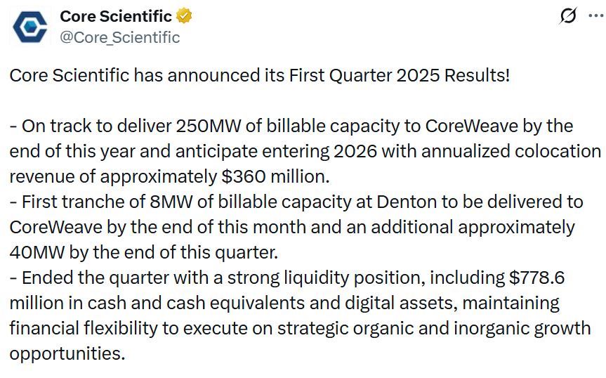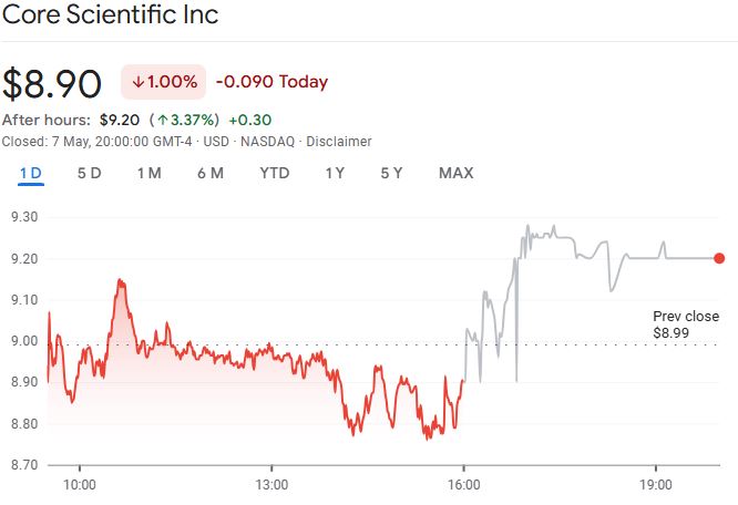 Акції в Core Scientific (CORZ) закрилися 7 травня, торгуючи на 1%, знизившись до 8,90 доларів, повідомляє Google Finance. Однак вони підскочили понад 3%, щоб торгувати на рівні 9,24 долара після дзвону.
