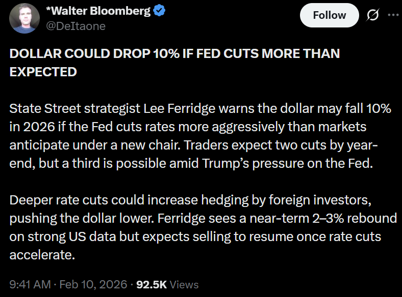 Виступаючи на конференції в Маямі, стратег State Street Лі Феррідж сказав, що долар може впасти на 10% цього року, якщо фінансові умови послабляться далі. Хоча він описав два зниження ставок як «розумний базовий варіант», він попередив, що ризики спрямовані в бік більшого зниження. «Можливі три», — сказав Феррідж.