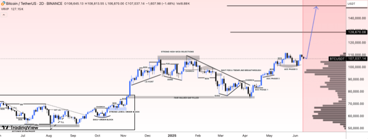 Завершення фази накопичення встановлює наступний рівень прориву до 130 000 доларів США, що було б на 20% більше, ніж поточний рівень. Однак це може бути не кінцем, оскільки аналітик криптовалюти встановив цільову ціль на суму 150 000 доларів.