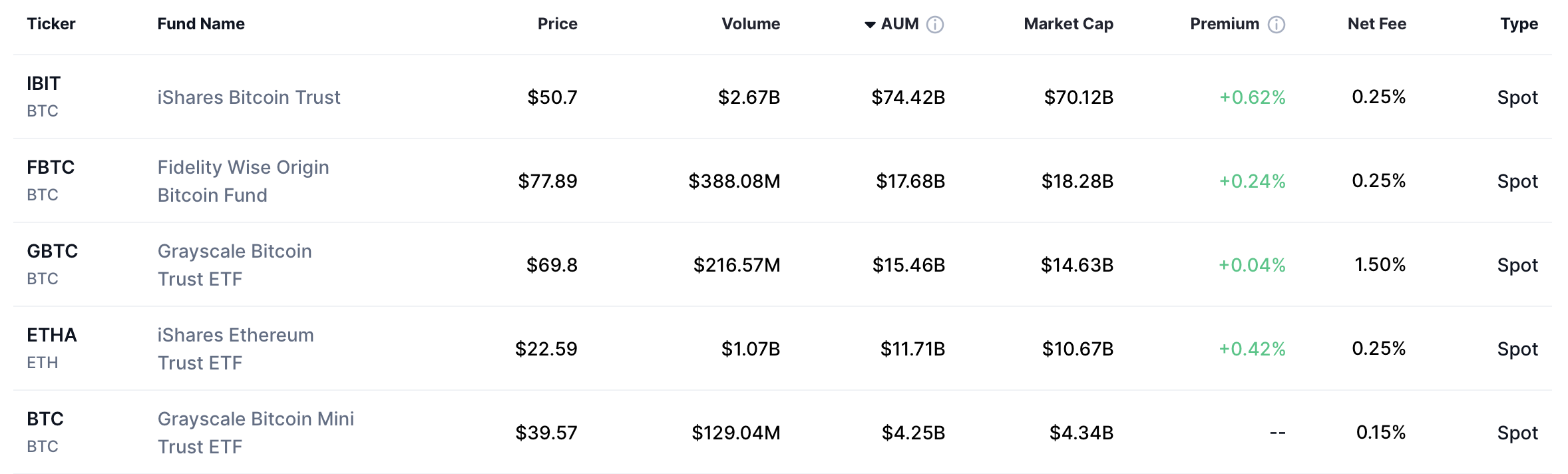 BlackRock, один із найбільших у світі менеджерів активів, запустив свій Bitcoin ETF у січні 2024 року. Згідно з даними CoinMarketCap, ринкова капіталізація фонду становить понад 70 мільярдів доларів, що робить його найбільшим спотовим фондом Bitcoin.