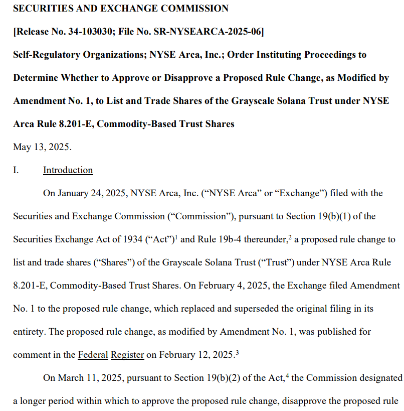 SEC затримала своє рішення щодо переліку Spot Solana Solana (SOL) Trust ETF на Нью -Йоркській фондовій біржі (NYSE) до жовтня 2025 року, згідно з поданням 13 травня регулятором цінних паперів.