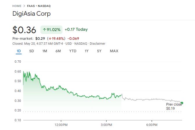 Акції DigiaSia, які торгують під тикерами FAAS на NASDAQ, закрили день більше 91% за 36 центів, показують дані Google Finance. Але хвилювання тривало довго.
