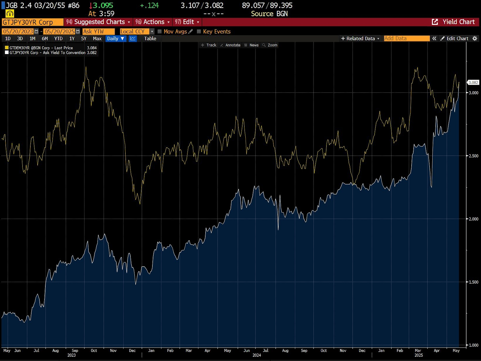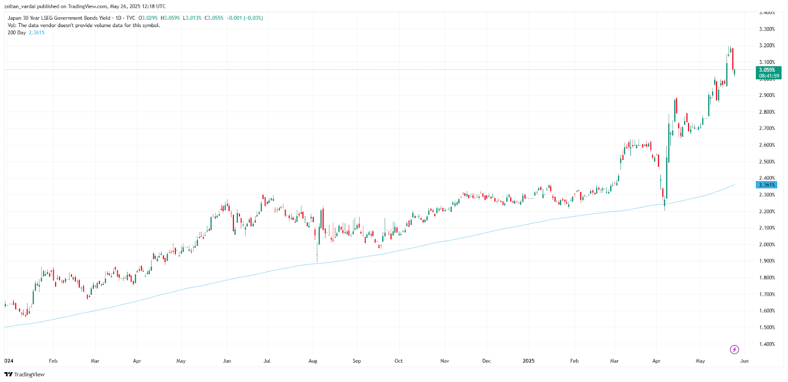 30-річна дохідність японських облігацій досягла нового рівня за весь час у розмірі 3,185% 20 травня 2025 року, перш ніж відступити до 3,115% 23 травня, показують дані TradingView.