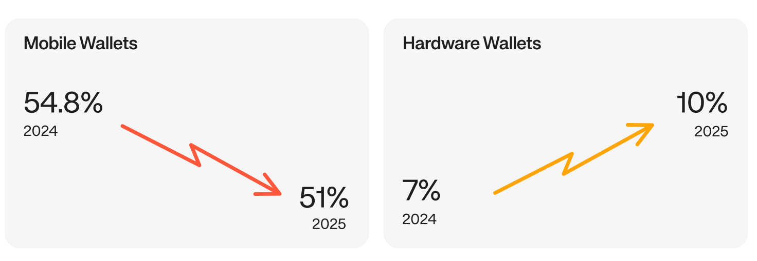 Лише 10% респондентів вважають за краще використовувати апаратний гаманець, порівняно з 7% року тому, сигналізуючи, що апаратні гаманці повільно набирають тягу серед більш досконалих користувачів криптовалют. Однак лише 3% нових інвесторів повідомили про використання апаратного гаманця.