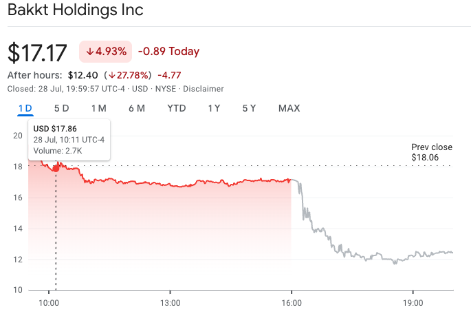 Акції в Bakkt Holdings (BKKT) закрили торгівлю в понеділок майже на 5% і продовжували падати приблизно на 27,8% після години до 12,40 доларів, додавши майже 31%, що видивиться до цього року.