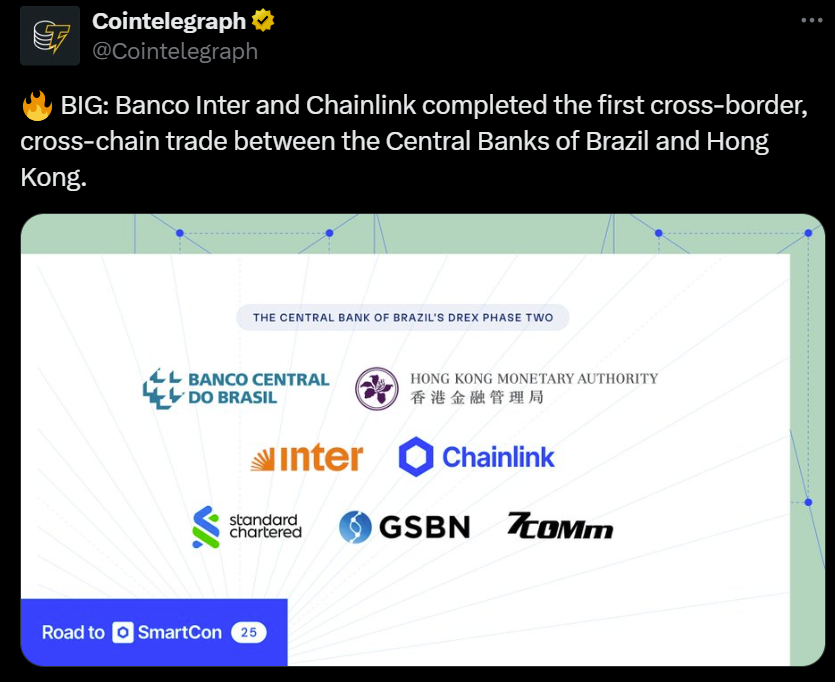 Banco Inter раніше працював з Chainlink, зокрема в попередній фазі 2 пілотного проекту бразильської цифрової валюти Drex.