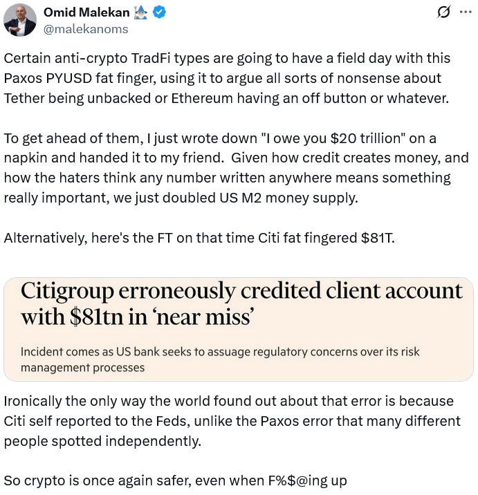 Випадкове карбування Paxos на суму 300 трильйонів PYUSD у середу, безсумнівно, викликає занепокоєння, але служить прикладом того, чому блокчейн може сяяти в традиційному банківському бізнесі.