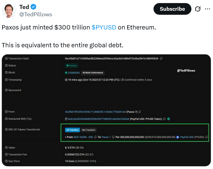 У середу Paxos помилково викарбував стейблкойн PayPal USD (PYUSD) на суму 300 трильйонів доларів, описавши це як «внутрішню технічну помилку».