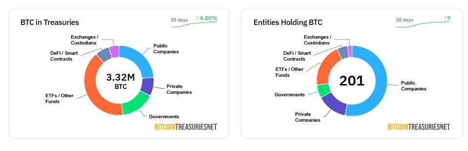 Корпоративні казначейства колективно містять біткойн на суму приблизно 80 мільярдів доларів, згідно з даними BitcoinTreasuries.net.