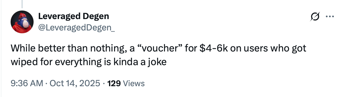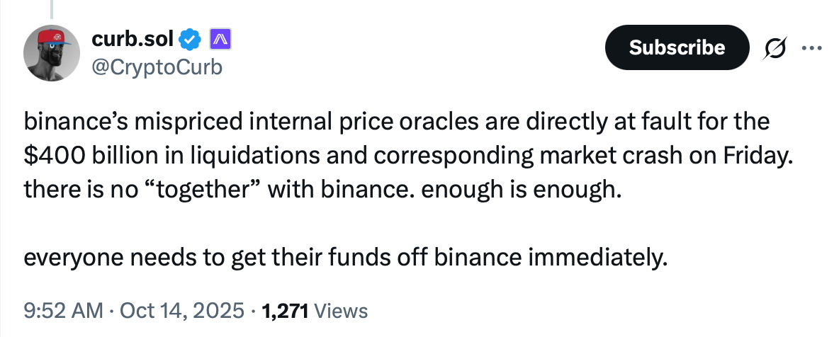 На відміну від цього, Curb. Ol USER писав, що “Оракули з неправильною ціною Binance” безпосередньо винні за 400 мільярдів доларів ліквідацій та відповідний аварій ринку “. Додаючи: «Кожному потрібно негайно отримати свої кошти від Binance.