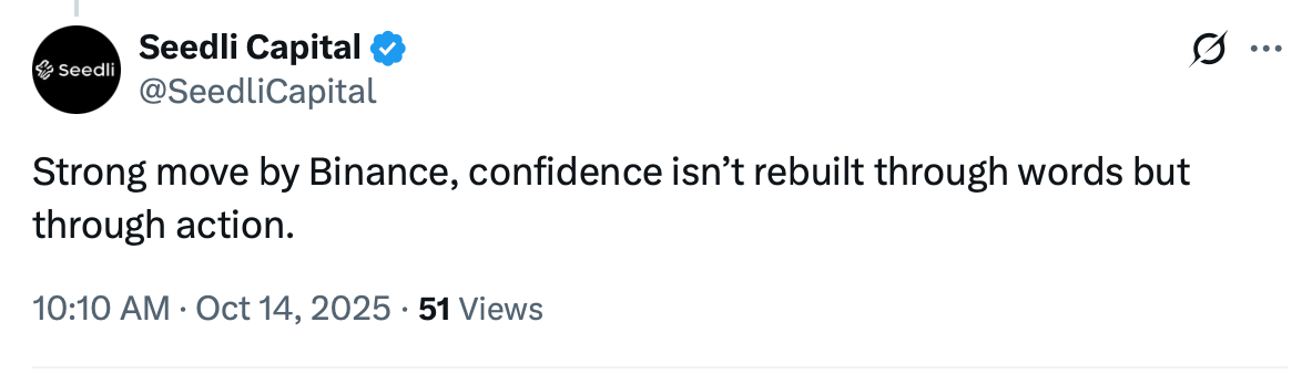 Оголошення у вівторок Бінанса отримала неоднозначні реакції на X. Хоча деякі користувачі, як і насінцикапітал, похвалили обмін на відновлення «впевненості», вживаючи заходів, інші були менш благодійними.
