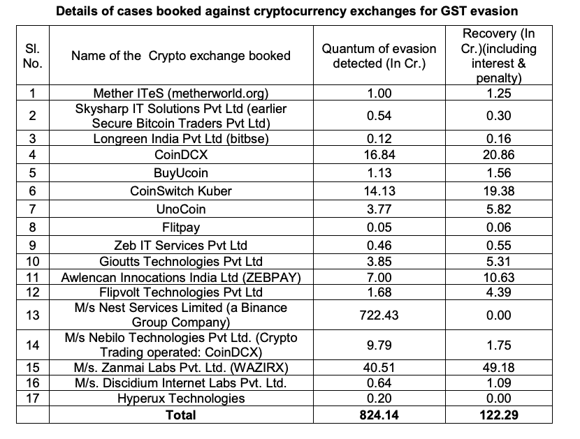 У заяві згадується 17 криптовалютних компаній, які були причетні до ухилення від сплати податку на товари та послуги, у тому числі WazirX з 40,5 крор рупій (4,8 мільйона доларів) несплачених податків на товари та послуги, CoinDCX з 16,84 крор рупій (1,9 мільйона доларів) і CoinSwitch Kuber з 14,13 крор рупій (1,7 мільйона доларів).