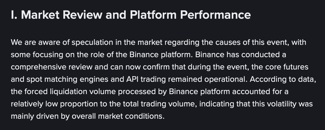 Він також зазначив, що примусові ліквідації на своїй платформі складали лише невелику частку загальної ринкової активності, що дозволяє припустити, що нестабільність в першу чергу зумовлена широкими ринковими умовами, а не внутрішньою несправністю.