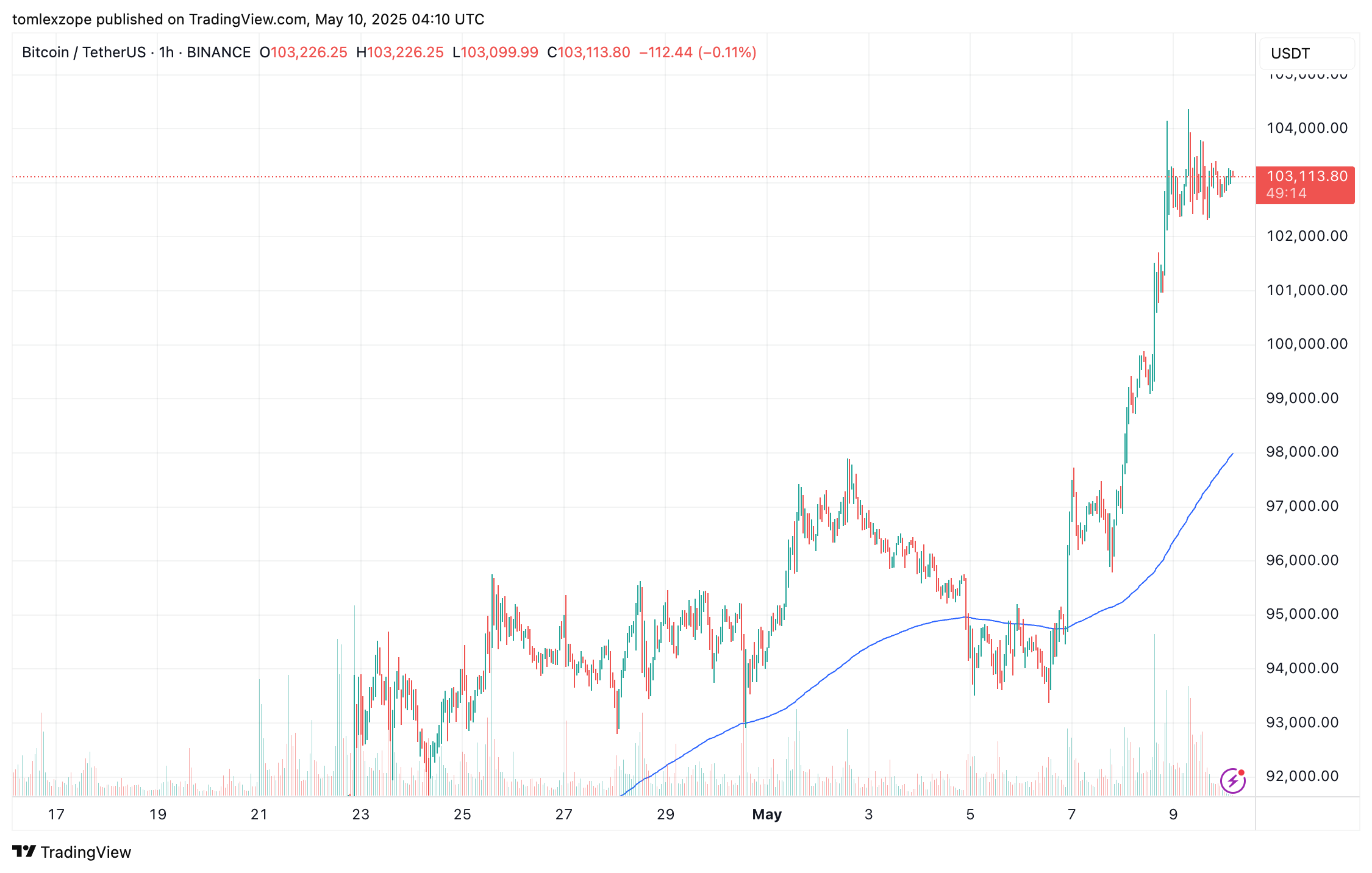 За останній тиждень ціна BTC вперше повернула оцінку шестизначної оцінки після втрати рівня 100 000 доларів у лютому. Станом на це написання, лідер ринку знаходиться трохи вище позначки 103 100 доларів, що відображає 0,5% стрибка за останні 24 години. У тижневі часові рамки, однак, вартість біткойна зростає більш ніж на 6%.