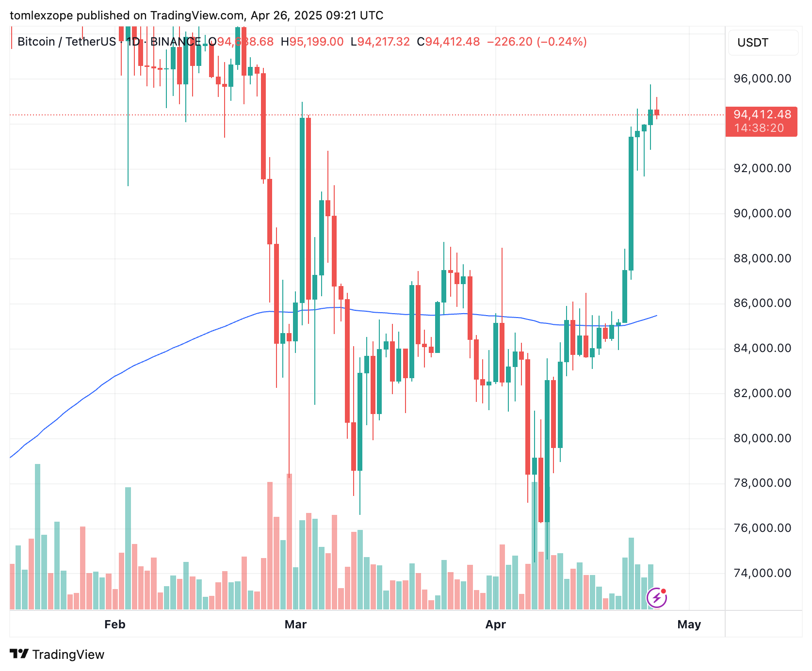Ціна біткойна вперше зросла вище 95 000 доларів США, що відображає збільшення на 2% за останні 24 години. За даними Coingecko, провідна криптовалюта зросла більш ніж на 13% за останні сім днів.