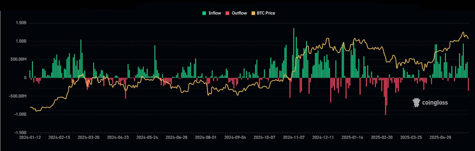 Протягом останніх 5 тижнів понад 9 мільярдів доларів увійшли в Spot BTC ETF, тоді як майже 3 мільярди доларів витікали від Gold ETF, спостерігали 29 травня президента магазину ETF Nate Geraci.