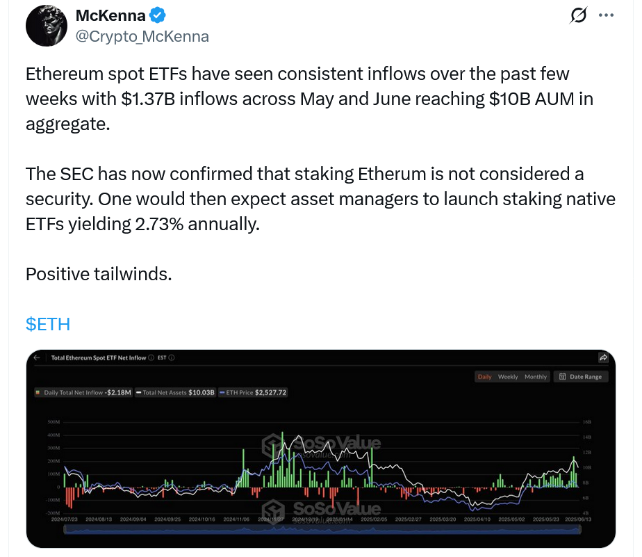 Сильні потоки виникають, коли цільова група з криптовалютою з цінних паперів та бірж застосовувала більш спільну підхід з гравцями галузі, і нещодавно уточнила, що укладання на рівні протоколів-це не є операцією з цінними паперами-потенційно відкриваючи двері для ефірних ETF з ставленнями в майбутньому.