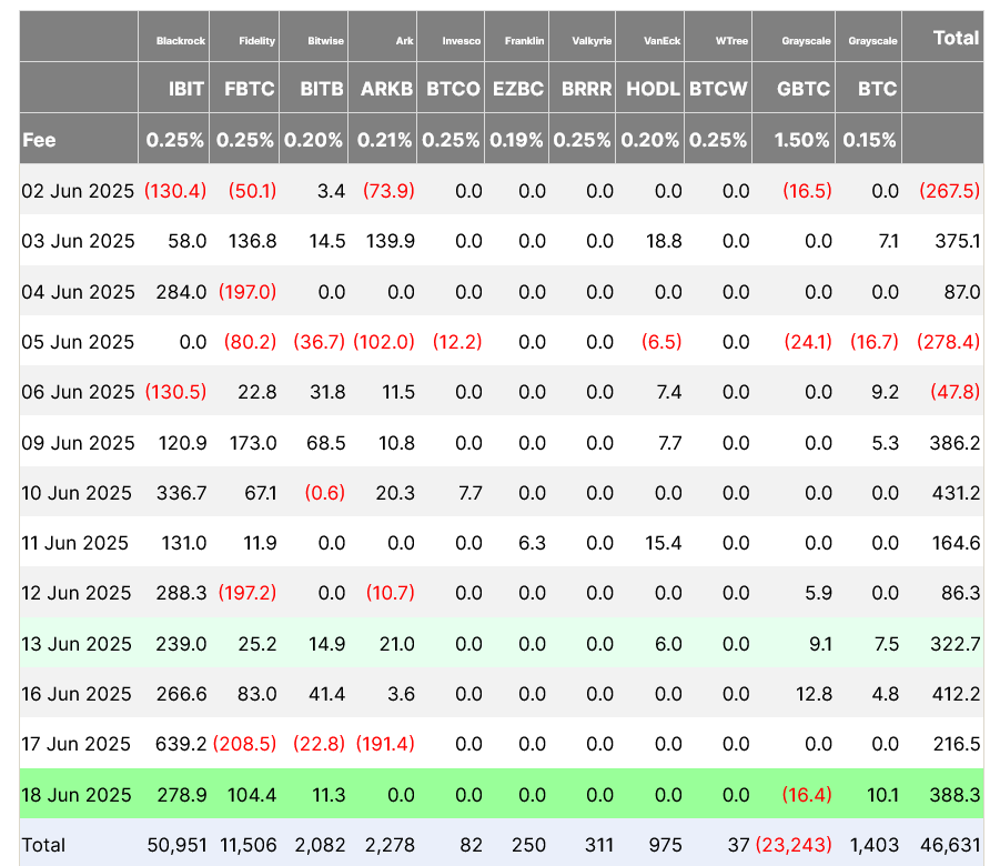 Щоденно надходять у плями Bitcoin ETF між 2-18 червня. Джерело: інвестори Farside